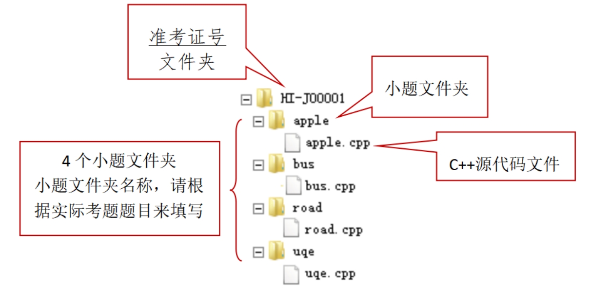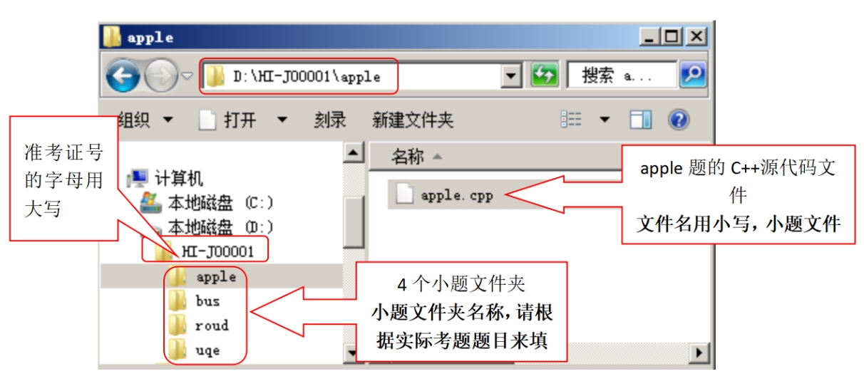 4、考生需在Windows系统的D盘建立准考证号文件夹(考号字母大写),然后在准考证号文件夹内创建小题文件夹(字母小写)。考生需将各小题的C++源代码文件保存在各小题文件夹(题目命名)内。程序源代码文件名和输入、输出文件名必须使用英文小写。源代码文件保存位置样例如图所示: